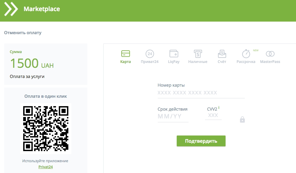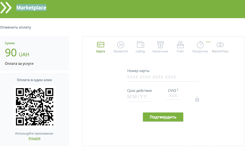 Попав на страницу Marketplace вам нужно выбрать интересующий способ оплаты и заполнить соответствующие поля