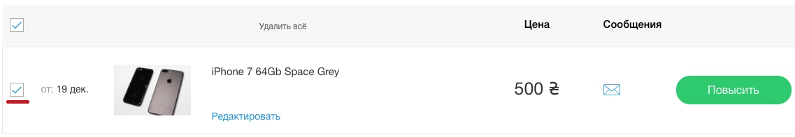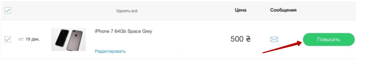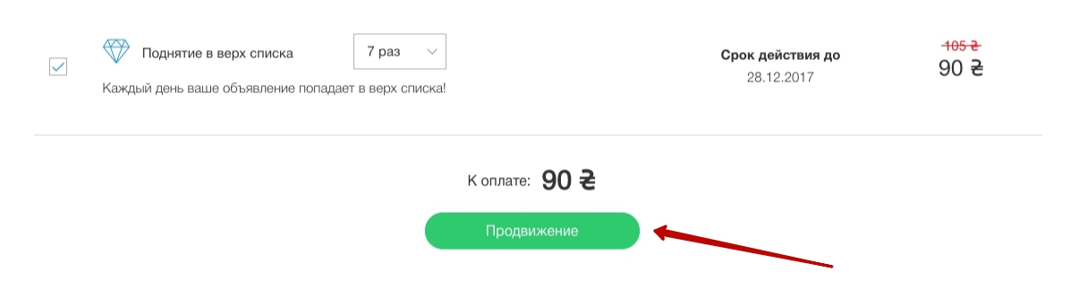 Услуга поднятие подтягивает объявление вверх, как будто вы разместили его минуту назад. Поднять свое объявление вы можете из Личного кабинета. Для этого в разделе Объявления, Активные нажать на зеленую кнопку Повысить