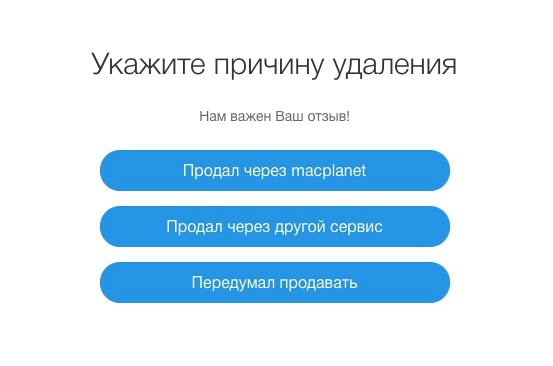 В верхней части окна появится кнопка Удалить. После чего у вас на экране появится всплывающее окно с просьбой указать причину удаления. После того как вы нажмете на кнопку с подходящим вариантом ответа ваше объявление тут же будет удалено.