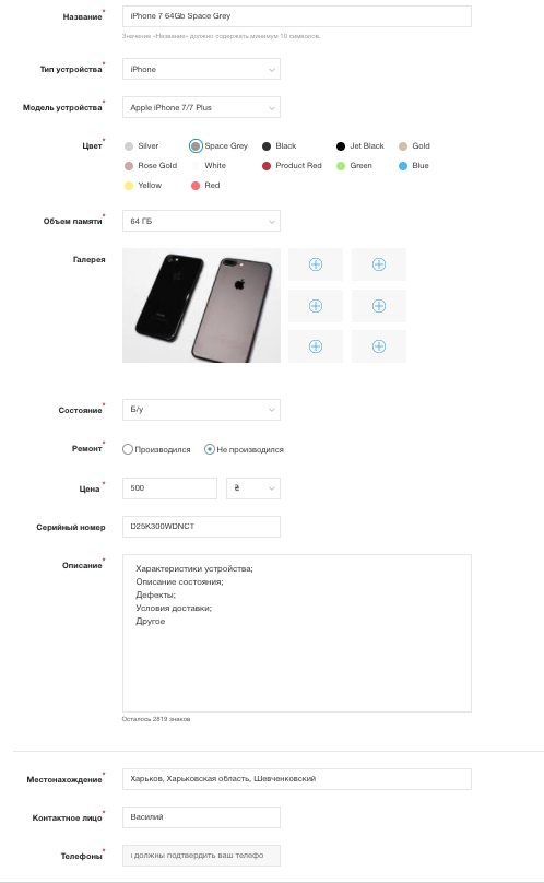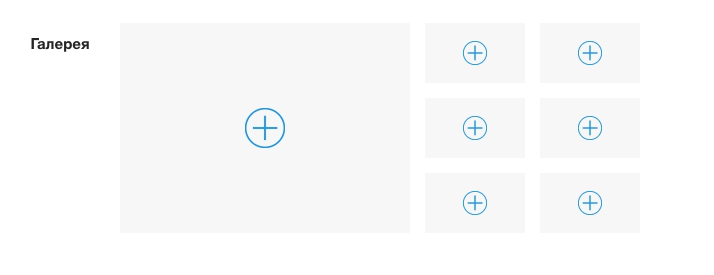В процессе оформления объявления вы столкнетесь с пунктом Галерея. Напротив которого, будут находится 1 большое прямоугольное поле и 6 маленьких со знаком “+” в середине.