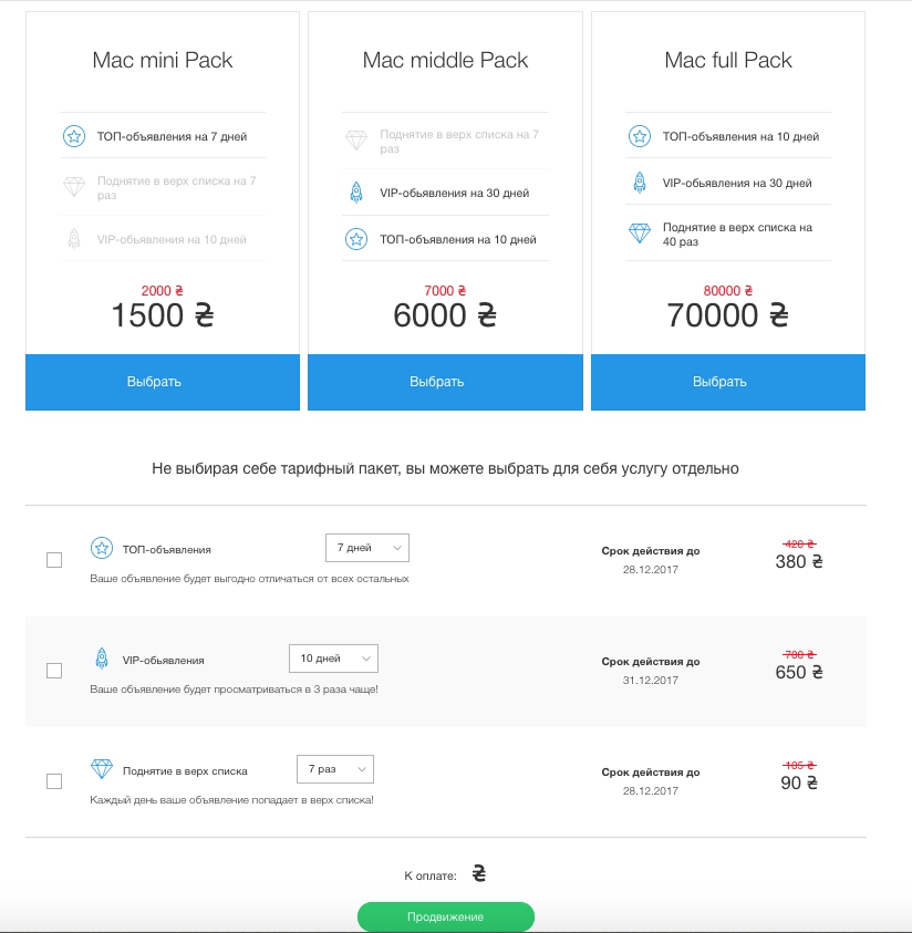 Mac middle Pack - данный пакет подразумевает расположение объявления в ТОПе в течении 10 дней и статус VIP-обьявления на 30 дней.